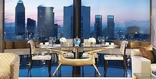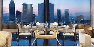 Внутри пентхауса на стенах отделка из перламутра, вставки из чистого золота и ткани с вплетенными платиновыми нитками. Раковина в ванной комнате сделана из блока хрусталя, а в спальне по стене льется фонтан. Кроме того, там есть библиотека, небольшой концертный зал со старинным роялем, помещение для медитации и даже зал СПА-процедур с персональным тренером и массажистом. К тем, кто останавливается в номере, круглосуточно прикреплен автомобиль Maybach или Rolls-Royce с водителем. Эта услуга включена в стоимость пентхауса, которая составляет 34 тыс. долл за ночь.