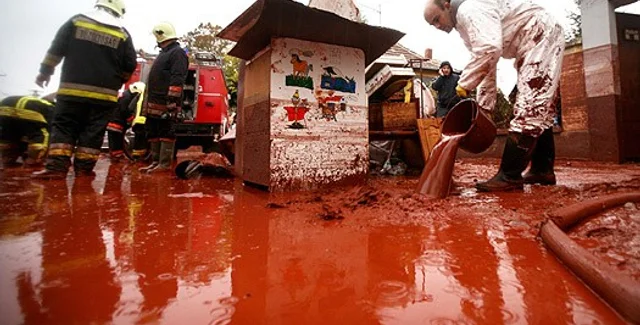Красный шлам - побочный продукт производства алюминия, опасный для окружающей среды и человека, - в его состав входит щелочь. Попадая на кожу, он способен вызвать серьезные ожоги.