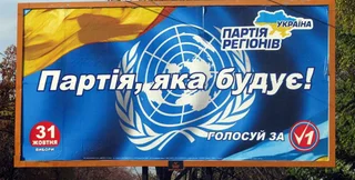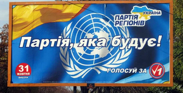 "Однако последней находкой является размещение на официальном логотипе Организации объединенных наций партийной рекламы с призывом голосовать за Партию регионов (№1) и слоганом: "Партия, которая строит", - сказал Томенко.