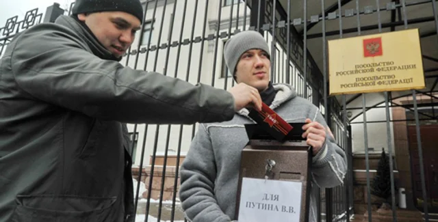 Под громкие крики "Позор!" в посольство РФ было передано коллективное письмо-обращение к президенту России Дмитрию Медведеву с требованиями принести извинения за заявления Путина или вообще освободить российского премьер-министра от занимаемой должности. Также был передан почтовый ящик с поздравительными открытками для Владимира Владимировича.
