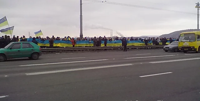 В Киеве на мосту Патона представители молодежных патриотических организаций провели символическую акцию воссоединения левобережной и правобережной Украины