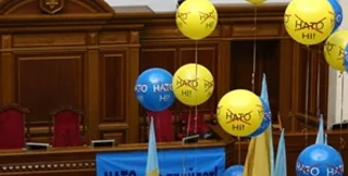 В сессионном зале размещены воздушные шарики с надписью "НАТО нет" и флаги Украины.
