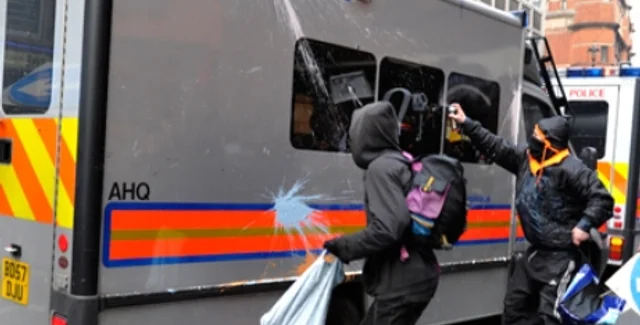 По словам правоохранителей, виновата в беспорядках группа из 200 анархистов, которая продвигается по центральной торговой улице Лондона Оксфорд стрит, забрасывает краской магазины и провоцирует остальных участников и полицейских.