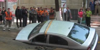 Сегодня в центре Харькова, на улице Гуданова, под асфальт ушел автомобиль Skoda Octavia