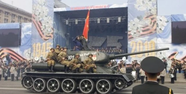 На главной улице столицы также можно увидеть военную технику времен Великой Отечественной войны, проезд которой организовала общественная организация "Киевский клуб "Красная звезда". В частности, по главной улице столицы прошли "Катюша", американский "Виллис", специальные армейские мотоциклы М-72 знаменитые полуторки, замыкал колонну техники Т-34.