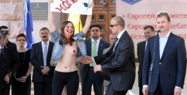 Во время выступления главы Киевской горадминистрации Александра Попова две девушки подошли вплотную к сцене. Одна девушка была оголена выше пояса, вторая держала в руках плакат с надписью "Дни до жопы, берите в Европу!"