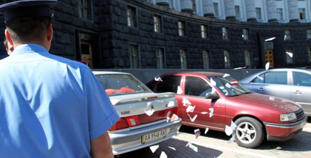 Председатель всеукраинского профсоюза "Народная солидарность" Алексей Кляшторный показательно уничтожил у здания Кабмина портреты Путина, Азарова и Януковича