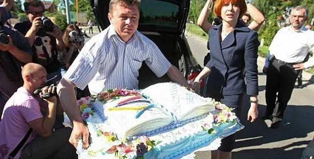 Торт, который президент Виктор Янукович передал журналистам, достался строителям, работающим рядом с "Межигорьем".