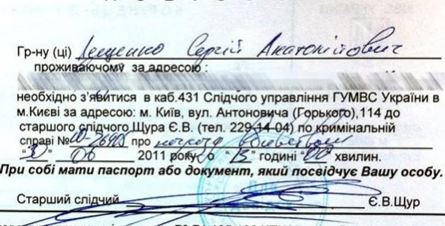 Притулу и Лещенко вызвали к следователю Е. Щуру на 13:0030 июня 2011 года