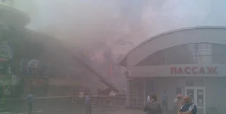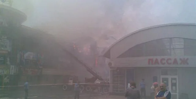 В центре Макеевки, Донецкая область, горит торгово-развлекательный комплекс "Рандеву". Здание охвачено огнем, на месте пожара сейчас работают спецмашины МЧС