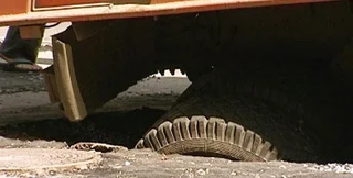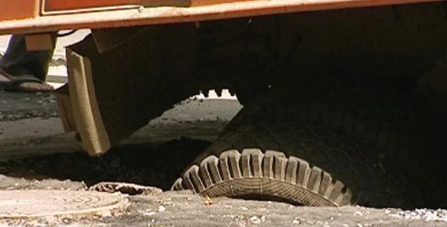 Из ямы грузовик достали краном, передает АТН. Через некоторое время рабочие заасфальтировали образовавшийся провал.