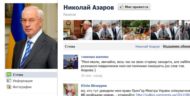 Напомним, у премьер-министра Украины Николая Азарова, согласно последней политической моде, появилась личная страничка в социальной сети Facebook. Первый пост Азарова в соцсети появился 27 мая. В первом же посте глава правительства признался, что каждый день отписываться не будет: много работы. Позже Азаров опубликовал в Facebook видеообращение, чтобы подтвердить, что он лично ведет свою страничку.