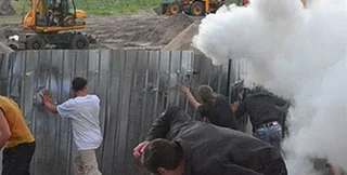 Молодые люди, которые все это время охраняли территорию, начали бросать камни и пустили в ход огнетушители. Одним огнетушителем разбили лобовое стекло экскаватора, который ломал забор.