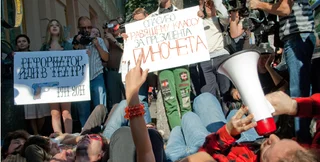 Некоторые депутаты, пытаясь войти в здание, вынуждены были переступать через лежащих на асфальте молодых людей.