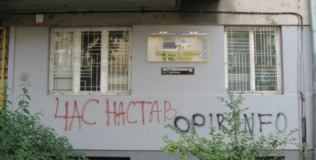 В ночь на 14 сентября во Львове члены организации "Автономное Сопротивление" разрисовали стену и разбили стекло в офисе городской организации Партии регионов на улице Дорошенко, 49. На своем сайте они выложили видео этой акции