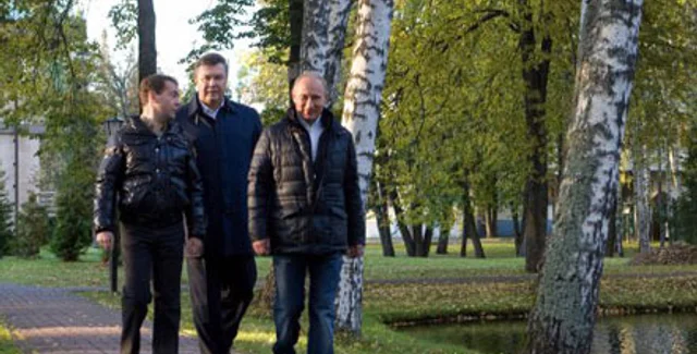 Журналисты представили фотосъемку, на которой российский президент Дмитрий Медведев, президент Украины Виктор Янукович и премьер-министр России Владимир Путин вчера прогулялись в резиденции президента РФ, на территории заповедника Завидово