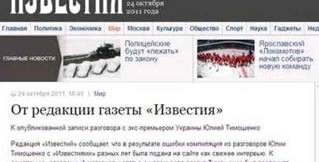 Позже пресс-секретарь экс-премьера Юлии Тимошенко заявила, что российская газета "Известия" опубликовала фальшивое интервью экс-премьера Юлии Тимошенко.