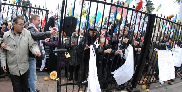 Как известно, недавно еще с одной стороны парламента появился забор. Там, где раньше стояла небольшая ограда, установлен двухметровый забор, на воротах которого повешен амбарный замок.