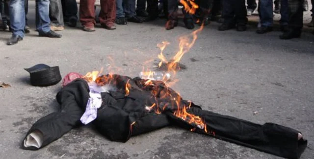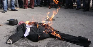 Кроме того, протестующие сожгли чучело, символизирующее Джемилева. Резиновая кукла была одета в костюм и галстук, а на месте головы находился листок бумаги с изображением лидера Меджлиса. До этого оппозиционеры также посадили чучело в инвалидную коляску, символизируя тем самым недееспособность лидера Меджлиса.