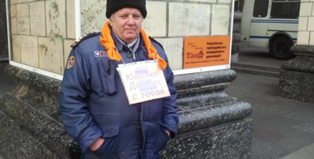 У здания Главпочтамта на площади Независимости сегодня утром появился один мужчина в оранжевом шарфе и с табличкой на шее "Ющенко, Донбасс с тобой"