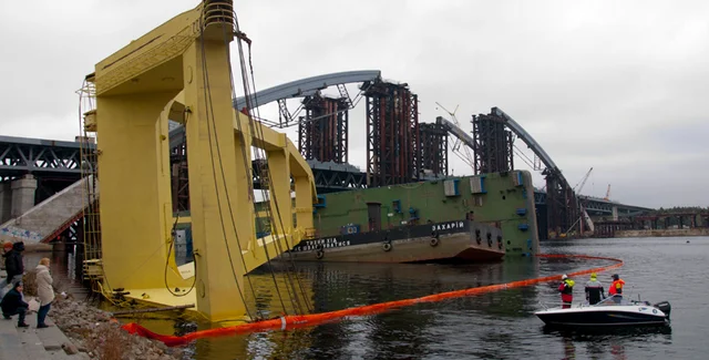 Напомним, 18 ноября 2011 года, в Киеве около 11:10 возле Набережно-Рыбальской улицы упал плавучий кран Захарий LK-600, работавший при монтаже арок Подольского мостового перехода. В результате произошло загрязнение воды топливом. В результате происшествия никто не пострадал.