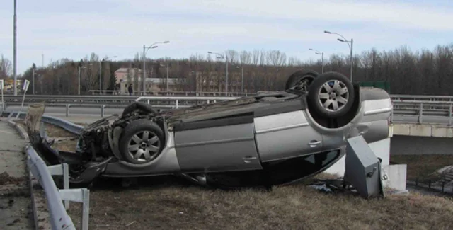 Автомобиль, двигаясь на высокой скорости, снес ограждение автобана, перевернулся на крышу и повис на электрораспределительным шкафом прямо над обрывом.