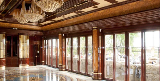Люстры, стоимостью почти $100 тыс., мрамор, позолота, хрусталь, ценные породы древесины – в таких условиях даже не живет – отдыхает – глава украинского государства, утверждает Сергей Лещенко, журналист интернет-издания Украинская правда, которое обнародовало снимки интерьера дебаркадера Галеон, расположенного на территории резиденции президента Виктора Януковича.