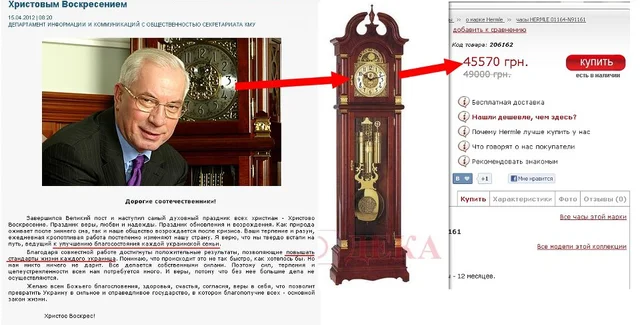 Блогер Клим Братковский на своей странице в Facebook заявил, что премьер-министр Украины Николай Азаров поздравил украинцев с Пасхой на фоне часов стоимостью 45 тысяч гривен