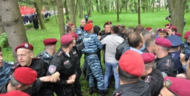 Как сообщалось, 9 мая в Тернополе представители ВО Свободапопытались помешать коммунистам провести свою акцию в Парке Славы. Как только колонна под флагами КПУ отправилась от Памятника Матери к Холму Славы, дорогу им перекрыли около 20 молодых людей, в частности депутаты городского и областного совета от ВО Свобода. К ним стали присоединяться и люди постарше, пытаясь заблокировать движение колонны, участники которой шли под охраной, в частности бойцов спецподразделения Беркут. Правоохранителям удалось оттеснить свободовцев.