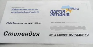 На конвертах в качестве отправителя значилась "Днепропетровская городская организация Партии регионов", от Евгения Морозенко. Размер стипендии составил 50 гривен.