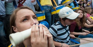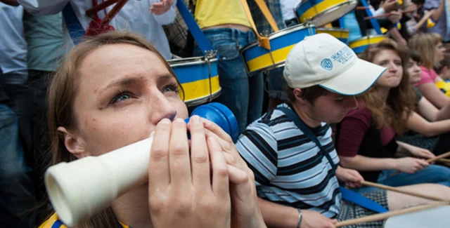 Они держат государственные флаги и флаги объединенной оппозиции с надписью "За Батькивщину".