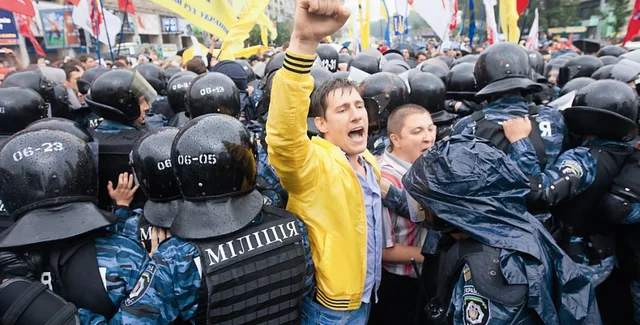 События 5 июня многим собравшимся напомнили будни оранжевой революции. Громкие лозунги против действующей власти, насквозь промокшие и замерзшие люди, пронзительные крики в толпе "Милиция с народом!". Но, как и в ноябре 2004 года, стражи порядка от обычных украинцев были далеки. С самого утра 2800 правоохранителей плотным кольцом окружили парламент и бело-голубой митинг сторонников власти. Их еще ночью организованно начали свозить в Киев десятки автобусов. Благодаря опеке силовиков одетые в синие дождевики гости столицы, преимущественно из восточных регионов страны, чувствовали себя уверенно, но от общения с журналистами наотрез отказывались. "Мы своих детей, своих женщин, которые у нас за спиной, готовы защищать", — заслоняя суровых молчаливых соратников, заявил местный житель — киевлянин Алексей Филиппов. Его воинственный задор со сцены подогревает скандально известный экс-нардеп от ПР Олег Калашников.