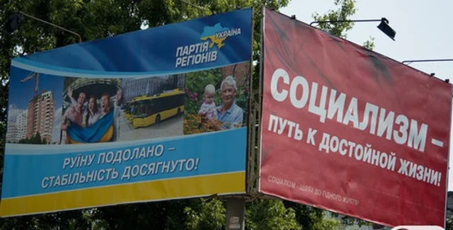 Сегодня, 30 июля, возле здания Международного выставочного центра, где проходит предвыборный съезд Партии регионов, появился плакат с закодированным посланием