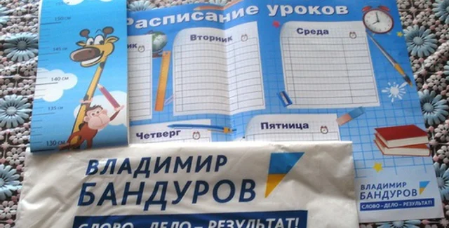 В Запорожье кандидат от Партии регионов в одномандатном избирательном округе № 79 Владимир Бандуров раздавал первоклассникам подарочные наборы со своим именем