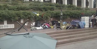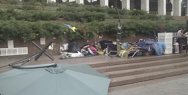 Участники акции в защиту украинского языка УкрДім - НоваХвиля заявляют, что сегодня коммунальщики снесли лагерь протестующих, а часть имущества (стенды, раскладушки, карематы) была вывезена в неизвестном направлении.