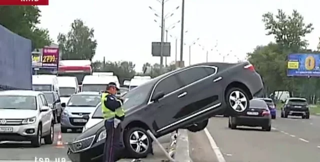 После сообщений очевидцев в интернете посмотреть на происшествие съехались люди из разных уголков столицы, говорится в сюжете ТСН. Водитель с прессой общаться не стал, ничего конкретного не сообщили и сотрудники ГАИ, которые работали на месте ДТП.