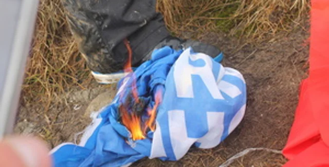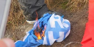 Сторонники ВО Свобода во время шествия к Михайловской площади по случаю 70-летия создания УПА сожгли флаги Компартии Украины и Партии регионов.