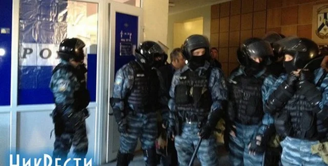 Бойцы Беркута штурмовали окружком в Первомайске"Как только работники Беркута приступили к исполнению постановления исполнительной службы относительно охраны общественного порядка во время проведения исполнительных действий, в правоохранителей полетели камни, нарушители пустили слезоточивый газ и брызгали из огнетушителей, а также выражались нецензурной бранью в адресу правоохранителей", - утверждают в министерстве.