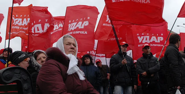 Они держат флаги партий Украинский демократический альянс за реформы (УДАР) Виталия Кличко, Всеукраинское объединение Свобода и Всеукраинское объединение Батьківщина.