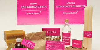 Наборы для встречи конца света поступили в магазины пару дней назад. В комплект входили карточка-напоминалка на тот случай, если владелец спецпакета потеряет память, шпроты, водка, гречка, свечи и спички, блокнот и карандаш для писем в будущее, инструкция с описанием игр, чтобы скоротать время, аптечка, состоящая из активированного угля, бинта и валидола, веревка и мыло. Стоил он 890 рублей.