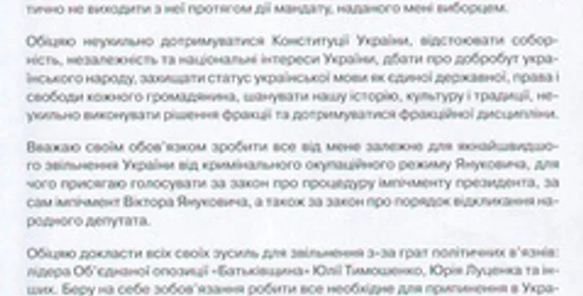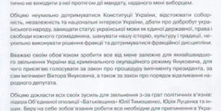 "Согласно присяге, каждый кандидат в народные депутаты от Батьківщина "перед Господом Богом и народом Украины публично поклялся соблюдать перечисленных обязательств". В частности, в тексте говорилось, что в случае принципиального изменения политической позиции вразрез с позицией Объединенной оппозиции Батьківщина избранный депутат "считает делом чести и обязуется сложить полномочия народного депутата Украины", - говорится в официальном решении.