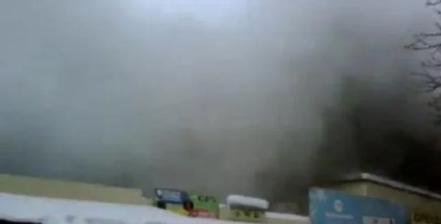 Возле рынка стоит огромная пробка, зеваки пытаются разглядеть, что же происходит. Из-за этого пожарные не могут добраться на место.