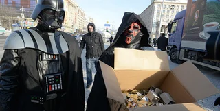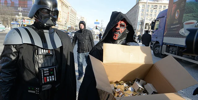В четверг, 20 декабря, в Киеве на Майдане Независимости герой фильма Звездные войны Дарт Вейдер раздал киевлянам предметы, необходимые для конца света.