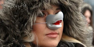 Участники акции держали в руках цветную фотографию акулы, а также плакаты с лозунгами "Поместим в аквариум владельцев Ocean Plaza, а не акулу!", "Готовишь семью к зоне?".