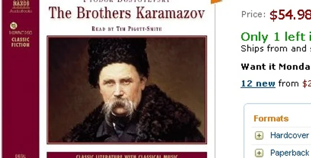 Британская компания Naxos Audiobooks совершила ошибку в выборе изображения для обложки Братьев Карамазовых Федора Достоевского, разместив на ней портрет украинского писателя Тараса Шевченко.