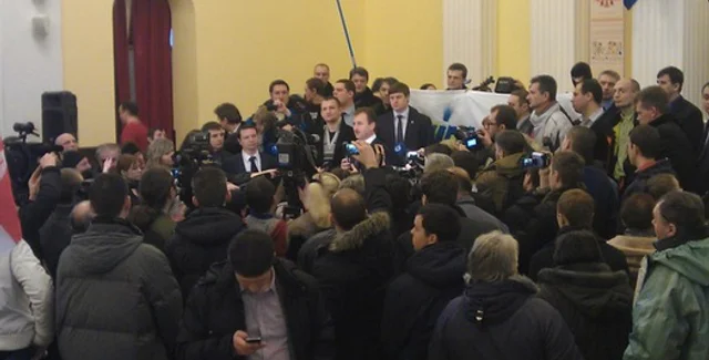 Сторонники ВО Свобода и ВО Батьківщина захватили колонный зал в здании Киевской городской государственной администрации.