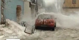 В центре Киева снежным массивом, упавшим с крыши, раздавило автомобиль.