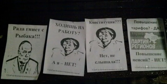 Стоит отметить, что на листовках изображены спикер Рады Владимир Рыбак и депутаты-регионалы Татьяна Бахтеева и Ефим Звягильский. Такие плакаты были подписаны партией УДАР.