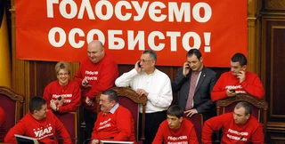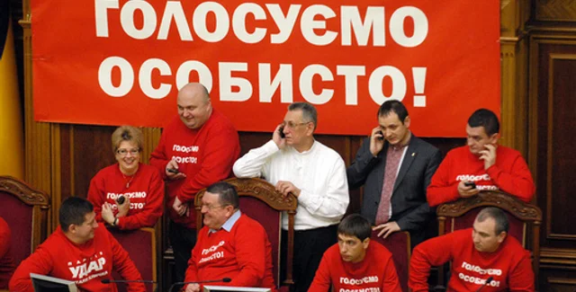 Верховная рада Украины остается заблокированной оппозиционерами от партии УДАР и Батьківщина, которые разместились в президиуме и вокруг него в сессионном зале.