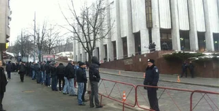Вход в Украинский дом также огражден. Вблизи щитов стоят несколько правоохранителей. Еще около сотни милиционеров дежурят неподалеку.